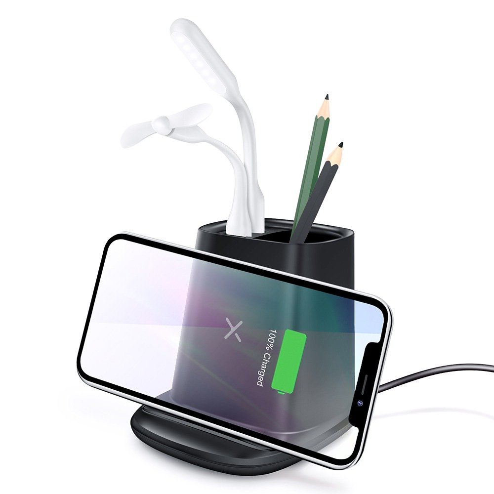 شاحن وايرلس 5 في 1 متعدد الوظائف يجمع بين شحن الهاتف اللاسلكي، الإضاءة المكتبية، وتنظيم المكتب، لتجربة عملية وأنيقة في مكان العمل أو المنزل.
