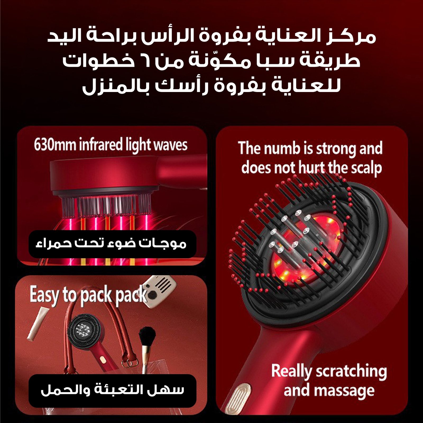 • الاستخدام: تدليك فروة الرأس، توزيع الزيوت، تعزيز صحة الشعر وفروة الرأس